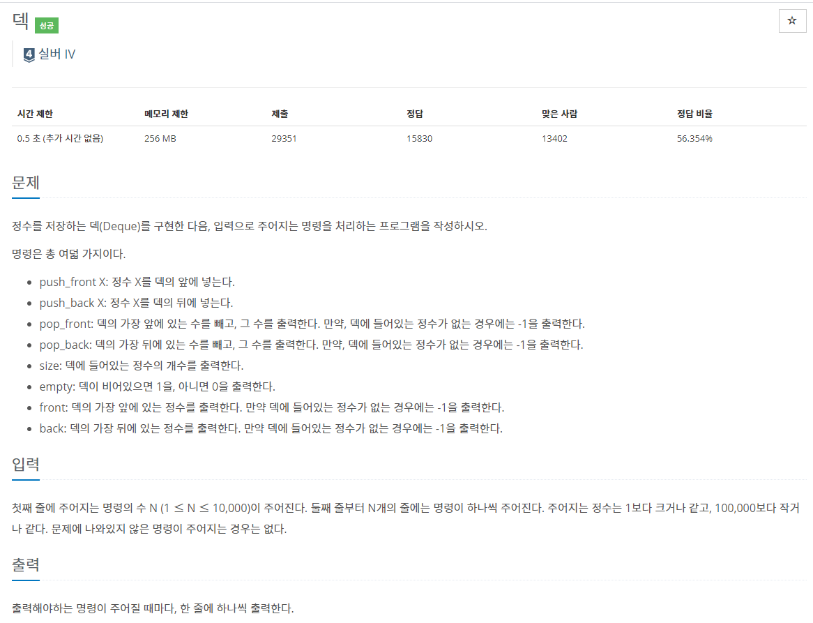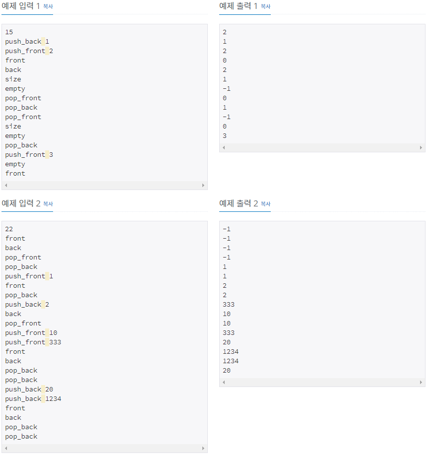 정수를 저장하는 덱(Deque)를 구현한 다음, 입력으로 주어지는 명령을 처리하는 프로그램을 작성하시오.