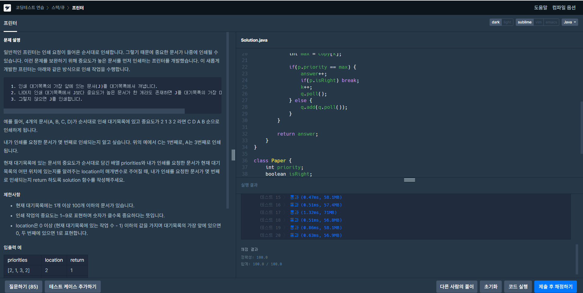 위와 같은 문제로 백준에서 풀은 똑같은 프린터 큐 문제가 있는데