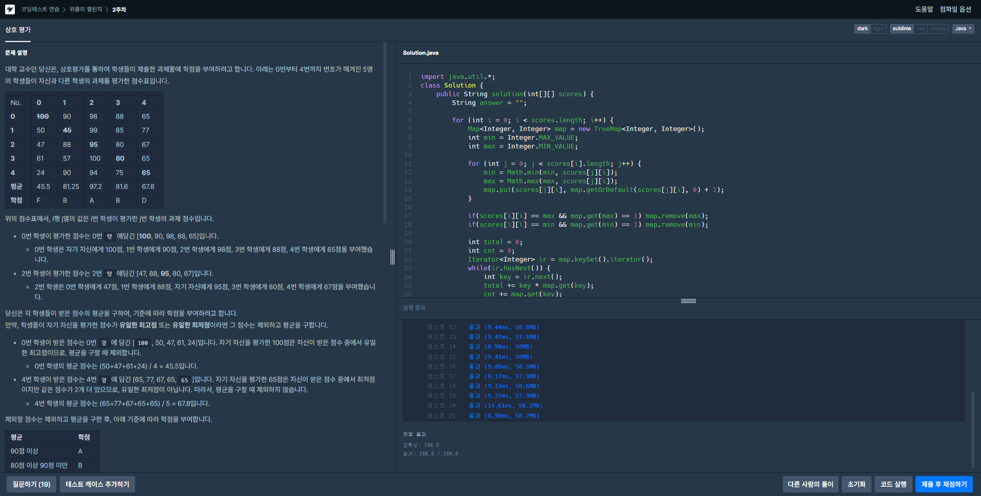 만약, 학생들이 자기 자신을 평가한 점수가 유일한 최고점 또는 유일한 최저점이라면 그 점수는 제외하고 평균을 구합니다.