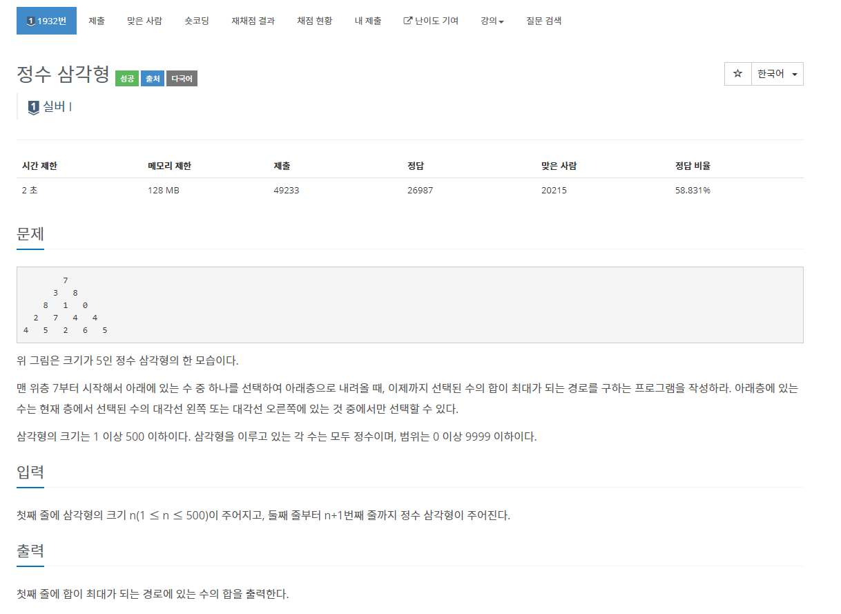 첫째 줄에 삼각형의 크기 n(1 ≤ n ≤ 500)이 주어지고, 둘째 줄부터 n+1번째 줄까지 정수 삼각형이 주어진다.