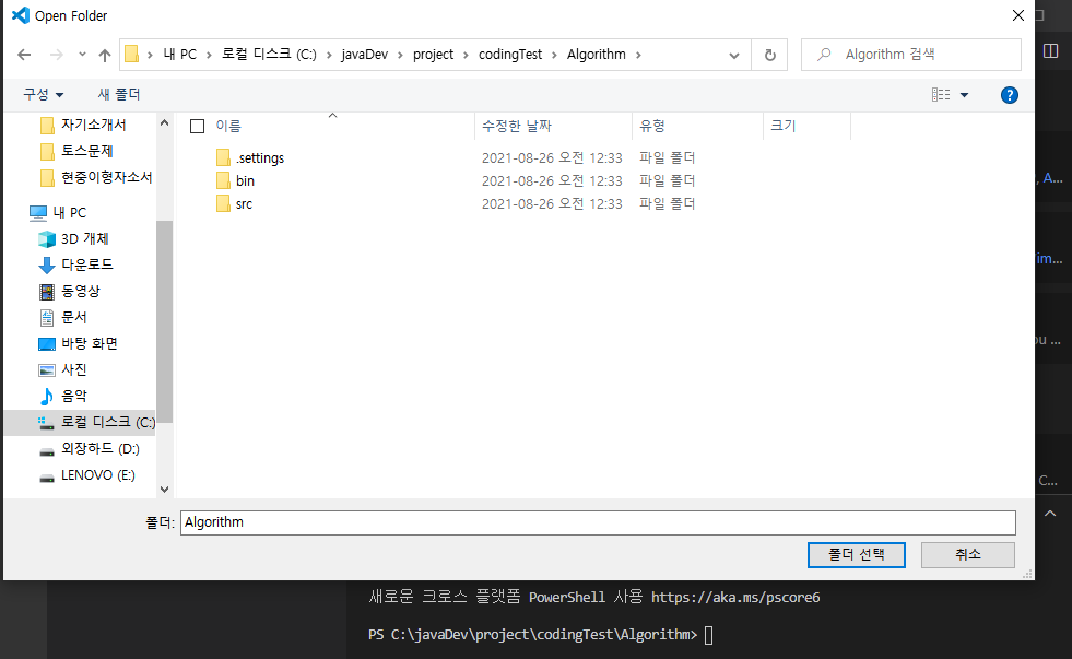 비쥬얼 스튜디오 코드를 실행시켜서 원하는 위치에서 폴더를 열어주면 된다.