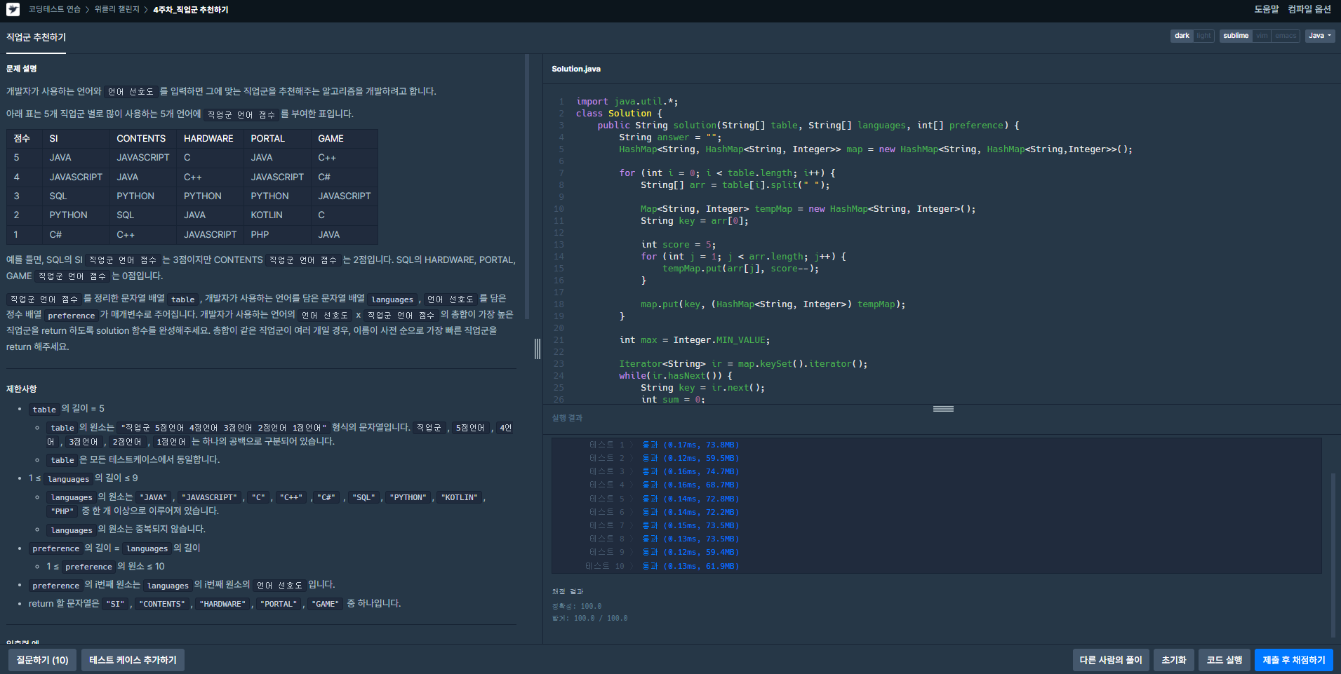 직업군 언어 점수를 정리한 문자열 배열 table, 개발자가 사용하는 언어를 담은 문자열 배열 languages, 언어 선호도를 담은 정수 배열 preference가 매개변수로 주어집니다. 개발자가 사용하는 언어의 언어 선호도 x 직업군 언어 점수의 총합이 가장 높은 직업군을 return 하도록 solution 함수를 완성해주세요. 총합이 같은 직업군이 여러 개일 경우, 이름이 사전 순으로 가장 빠른 직업군을 return 해주세요.