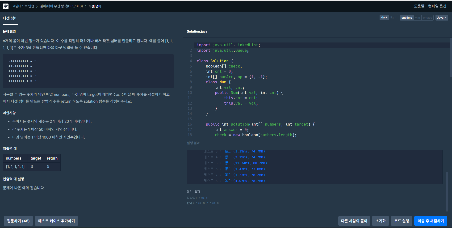 n개의 음이 아닌 정수가 있습니다. 이 수를 적절히 더하거나 빼서 타겟 넘버를 만들려고 합니다. 예를 들어 [1, 1, 1, 1, 1]로 숫자 3을 만들려면 다음 다섯 방법을 쓸 수 있습니다. -1+1+1+1+1 = 3 +1-1+1+1+