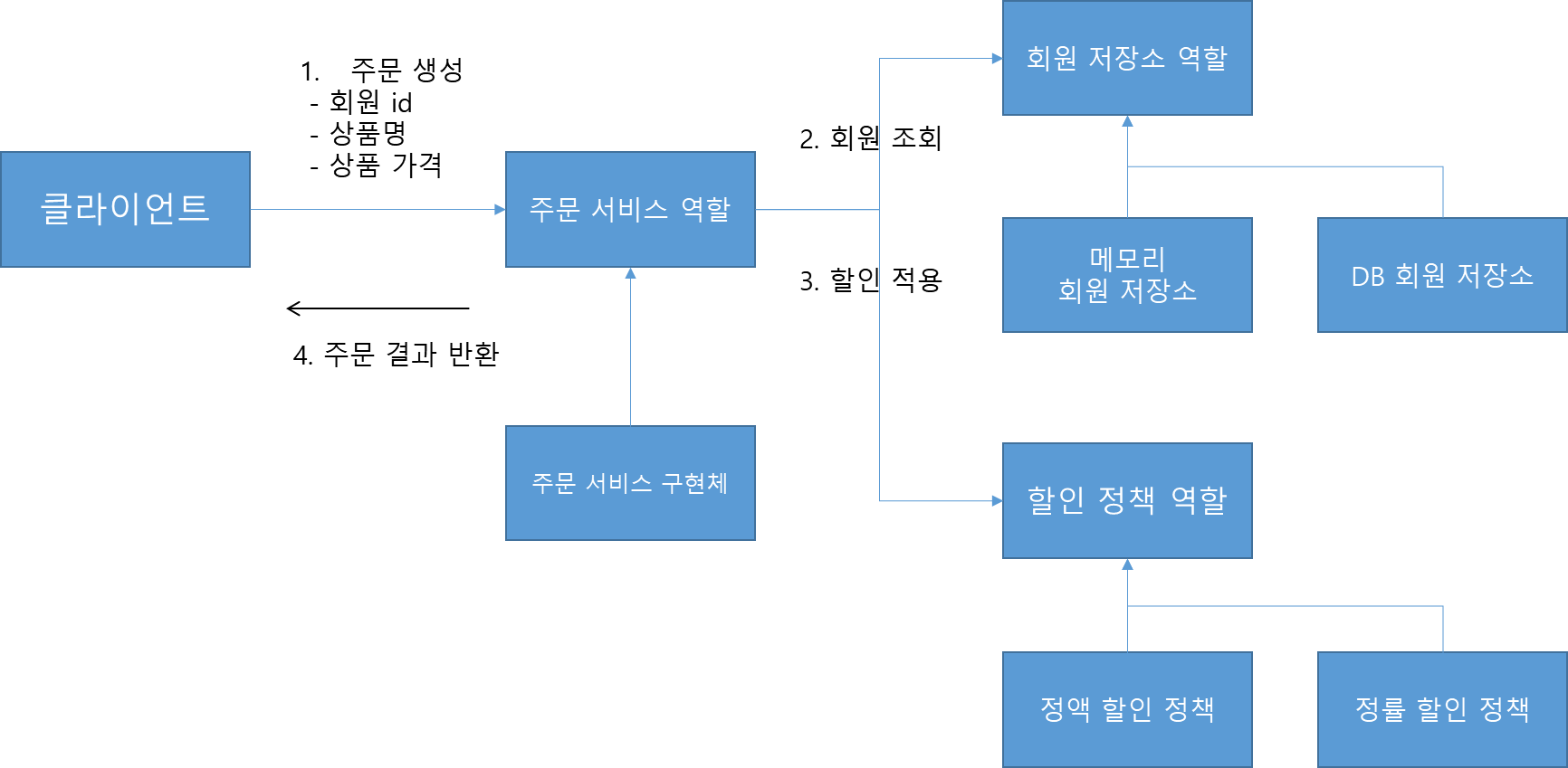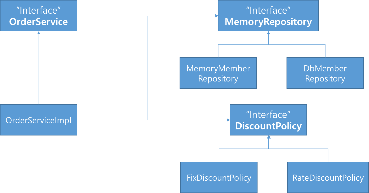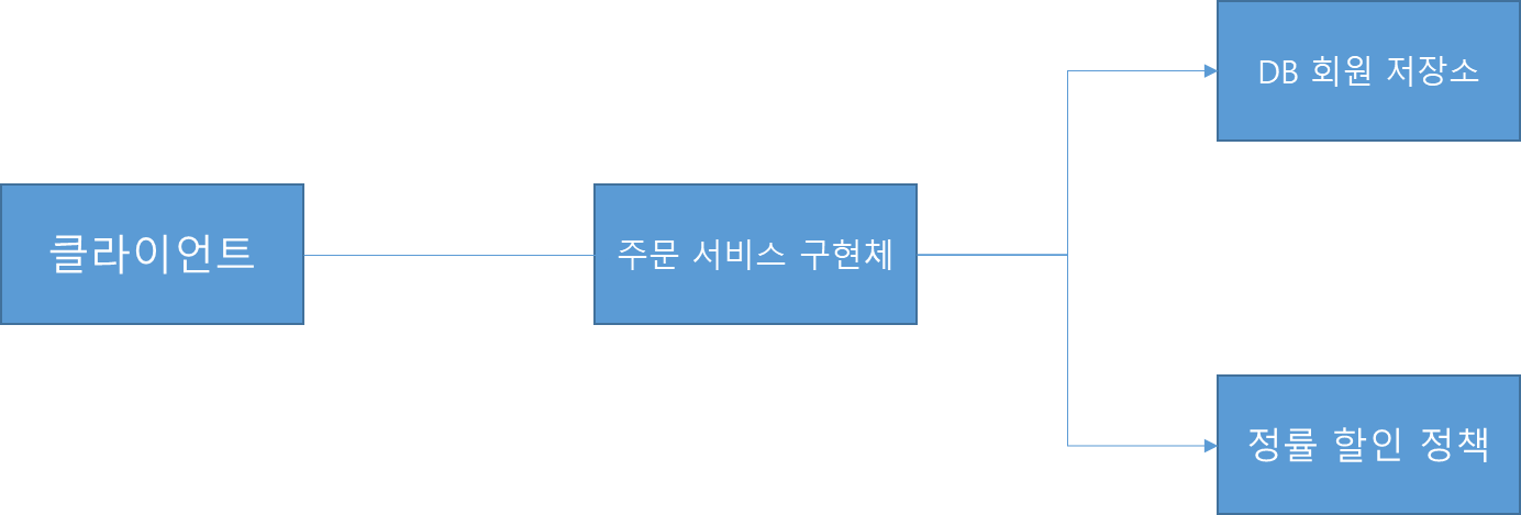 회원을 메모리가 아닌 실제 DB에서 조회하고, 정률 할인 정책(주문 금액에 따라 %할인)을 지원해도 주문 서비스를 변경하지 않아도 된다.