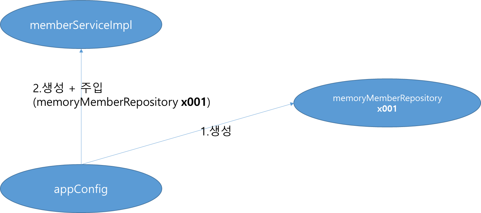 - 'appConfig' 객체는 'memoryMemberRepository' 객체를 생성하고 그 참조값을 'memberServiceImpl'을 생성하면서 생성자로 전달한다.