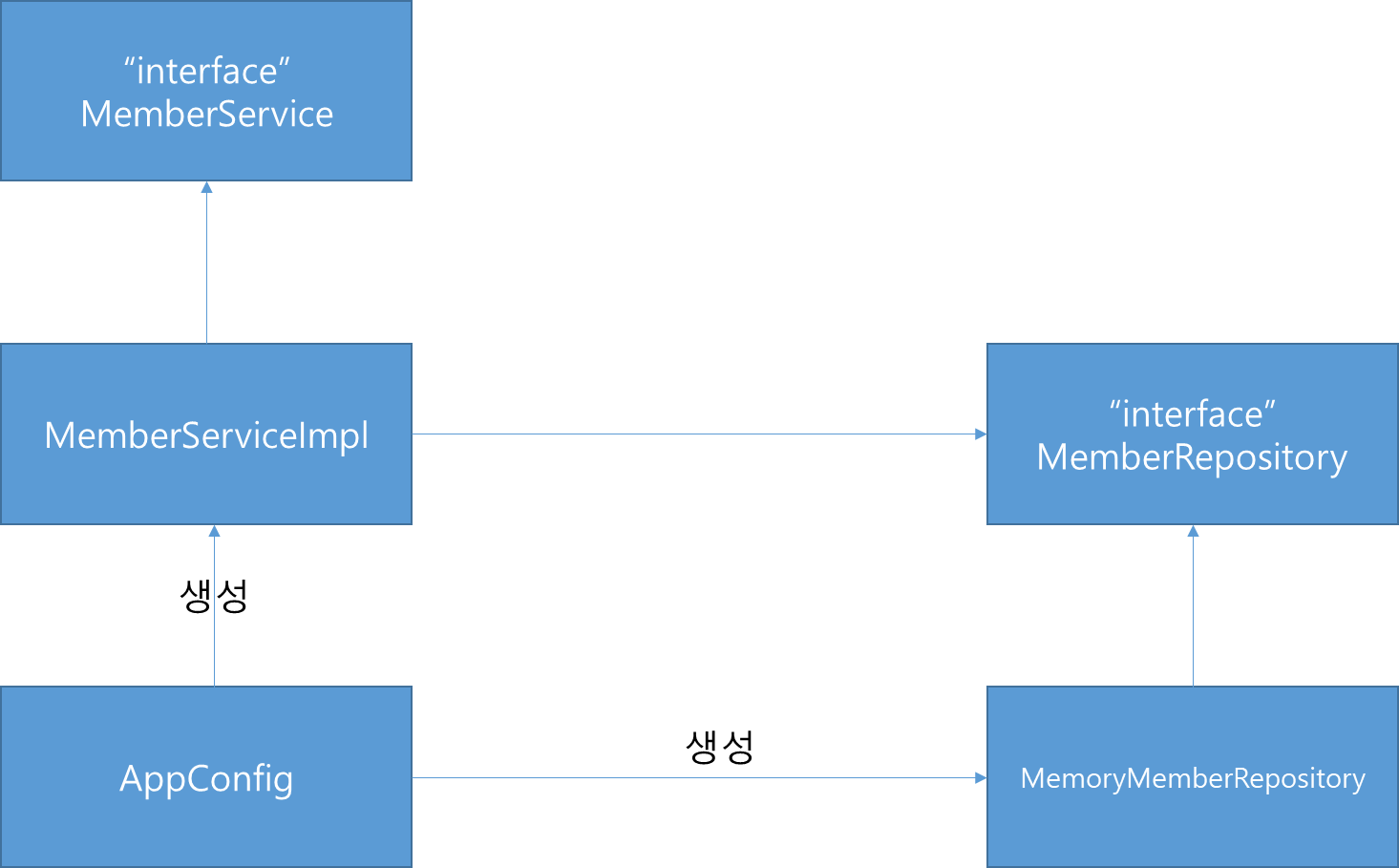 - 'appConfig' 객체는 'memoryMemberRepository' 객체를 생성하고 그 참조값을 'memberServiceImpl'을 생성하면서 생성자로 전달한다.