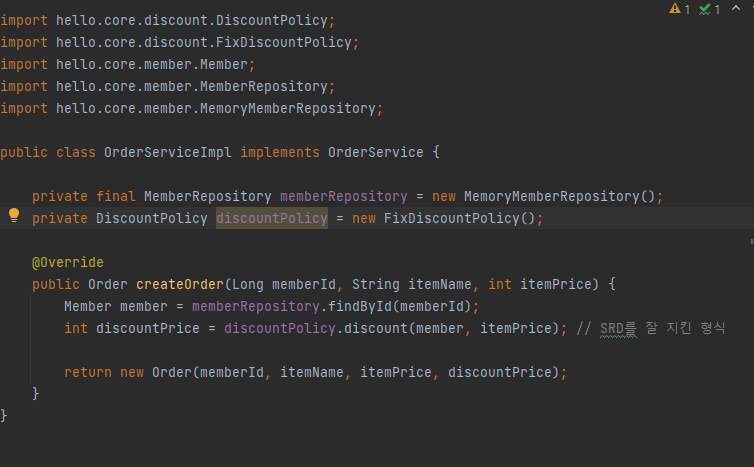 int discountPrice = discountPolicy.discount(member, itemPrice); // SRD를 잘 지킨 형식