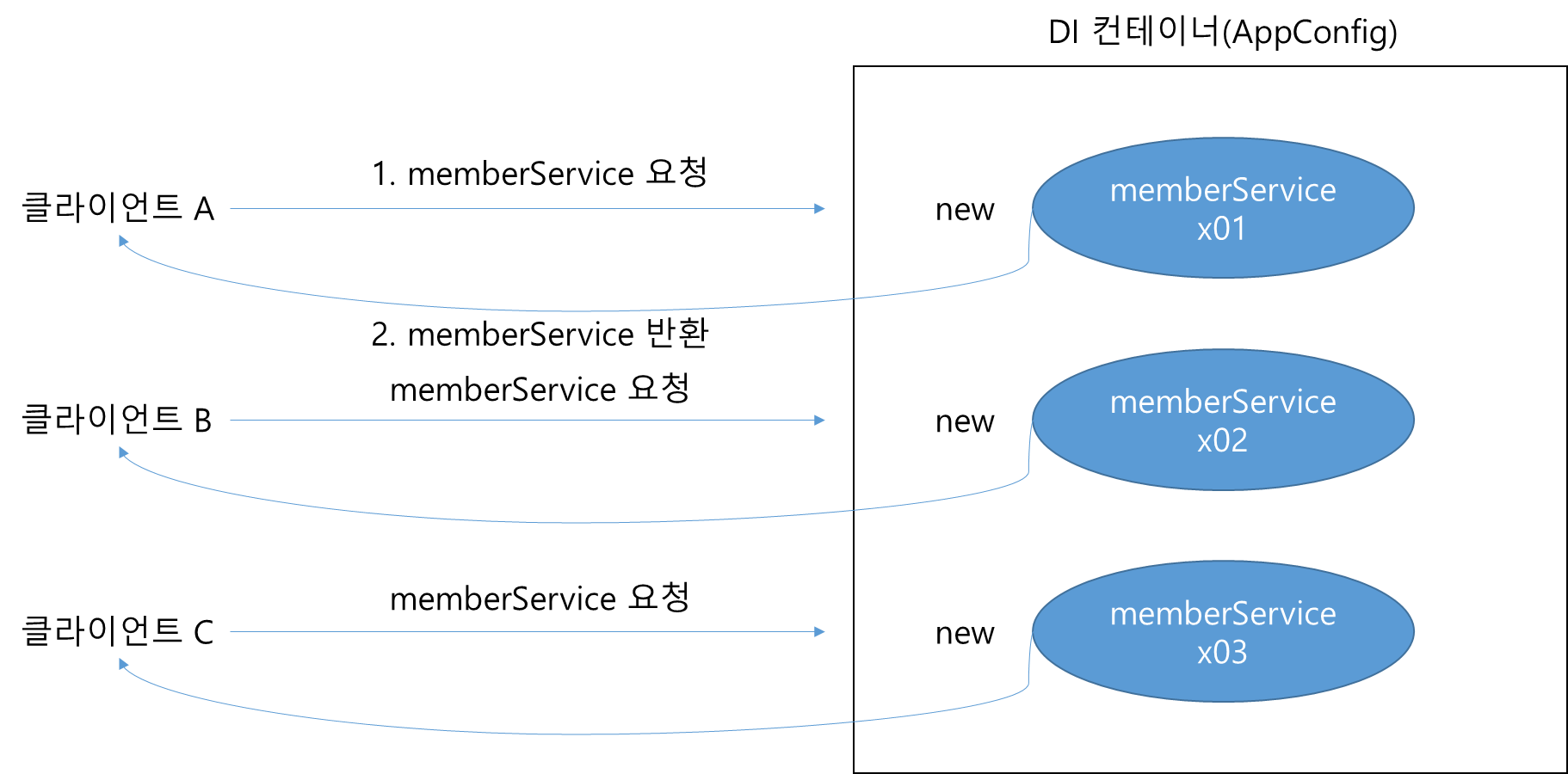 - 우리가 만들었던 스프링 없는 순수한 DI 컨테이너인 AppConfig는 요청을 할 때마다 객체를 새로 생성한다.