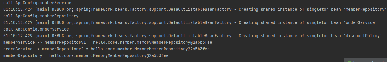 - AppConfig의 자바 코드를 보면 분명히 각각 2번 'new MemoryMemberRepository' 호출해서 다른 인스턴스가 생성되어야 하는데?