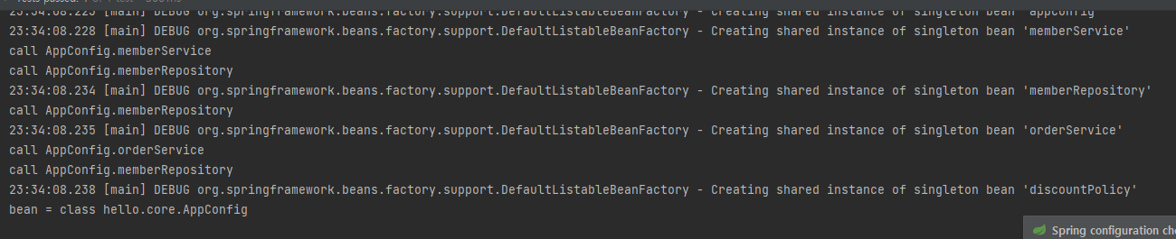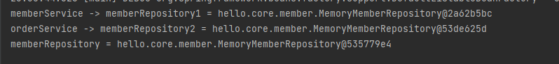 이 출력 결과를 통해서 MemberRepository가 총 3번 호출된 것을 알 수 있다. 1번은 @Bean에 의해 스프링 컨테이너에 등록하기 위해서이고, 2번은 각각 memberRepository()를 호출하면서 발생한 코드다.