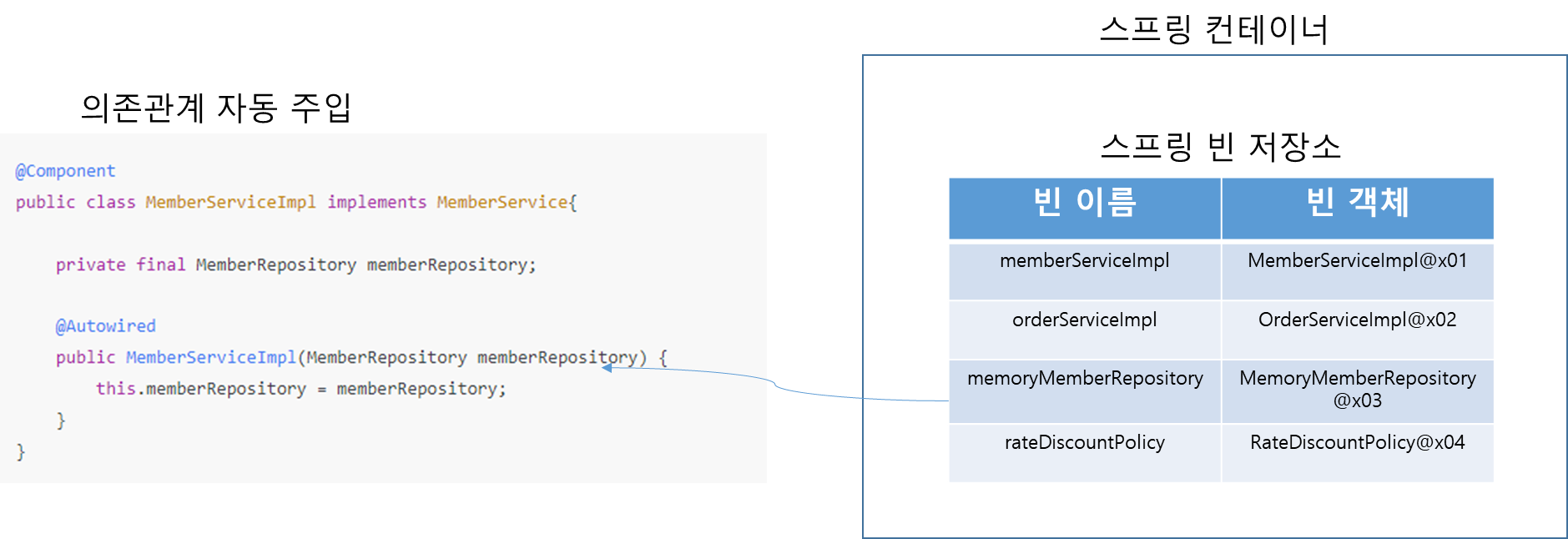 @Autowired // 이걸 생성자에 붙여주면 MemberRepository 타입에 맞는 빈을 알아서 의존성을 주입해준다.