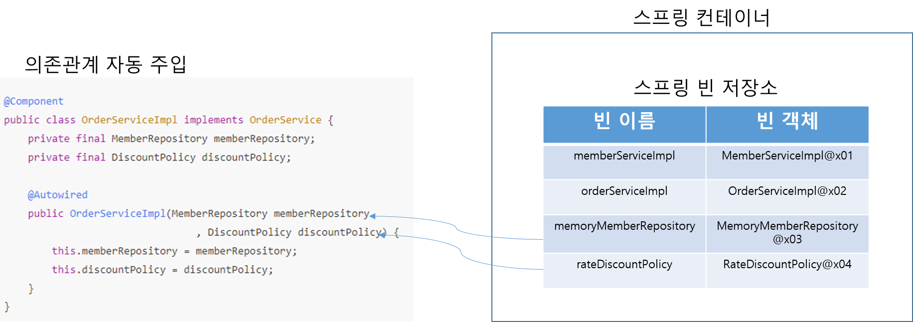 @Autowired // 이걸 생성자에 붙여주면 MemberRepository 타입에 맞는 빈을 알아서 의존성을 주입해준다.