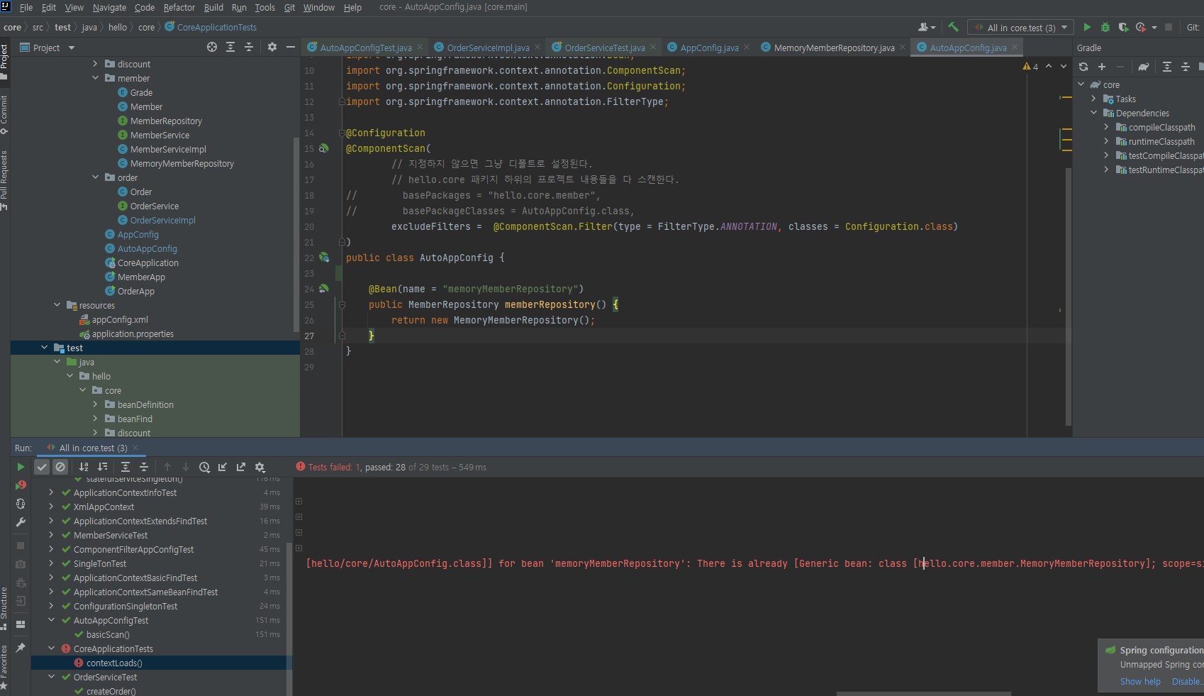 AutoAppConfig에서 MemoryMemberRepository를 bean으로 재차 등록해주면 충돌이 나기 때문에