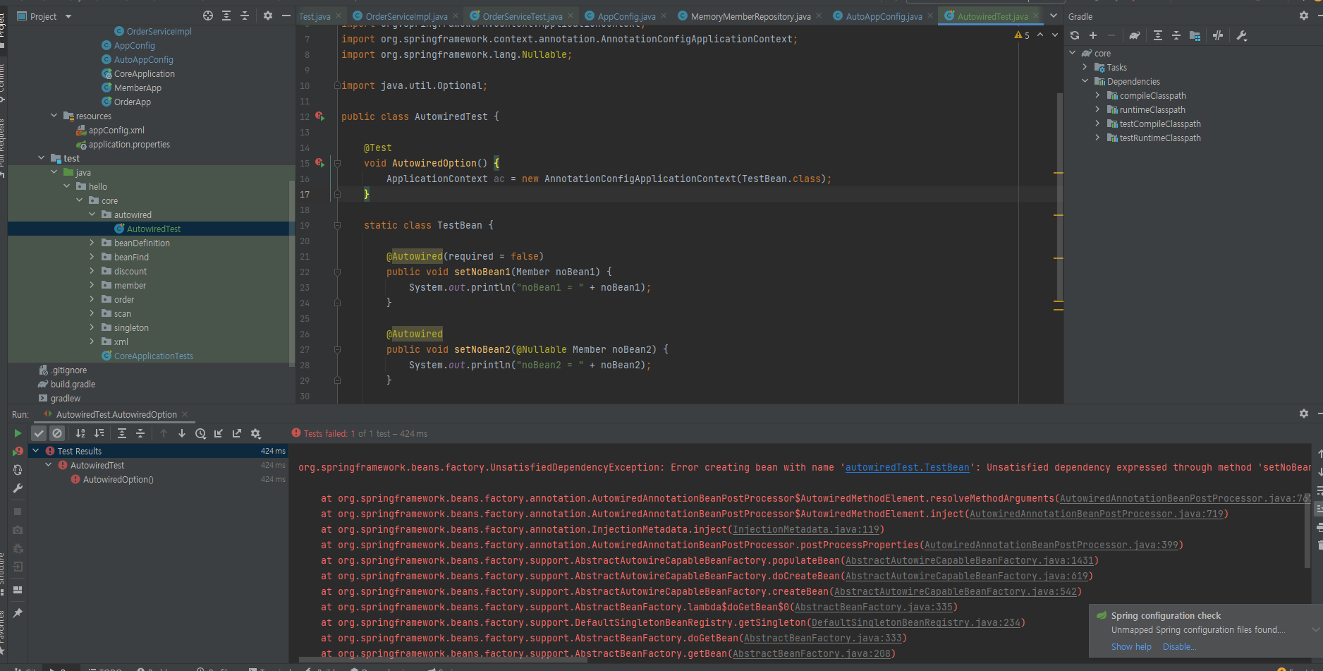 여기서, setNoBean1의 애노테이션 Autowired에 옵션 required = true이거나 required 옵션이 제외되면