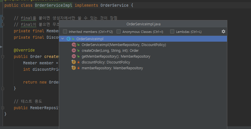 public OrderServiceImpl(MemberRepository memberRepository, DiscountPolicy discountPolicy) {