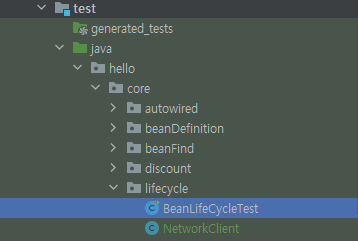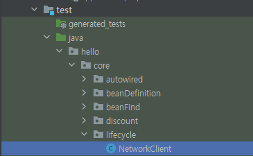 간단하게 외부 네트워크에 미리 연결하는 객체를 하나 생성한다고 가정해보자. 실제로 네트워크에 연결하는 것은 아니고, 단순히 문자만 출력하도록 했다. 이 'NetworkClient'는 애플리케이션 시작 시점에 'connect()'를 호출해서 연결을 맺어두어야 하고, 애플리케이션이 종료되면 'disConnect()'를 호출해서 연결을 끊어야 한다.
