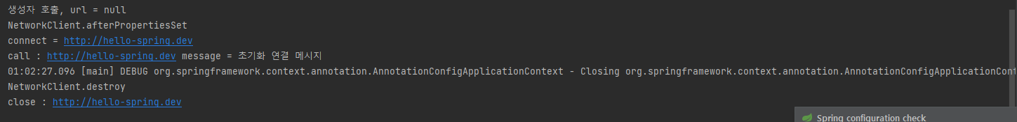 - 그리고 스프링 컨테이너의 종료가 호출되자 소멸 메서드가 호출된 것도 확인할 수 있다.