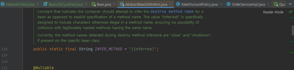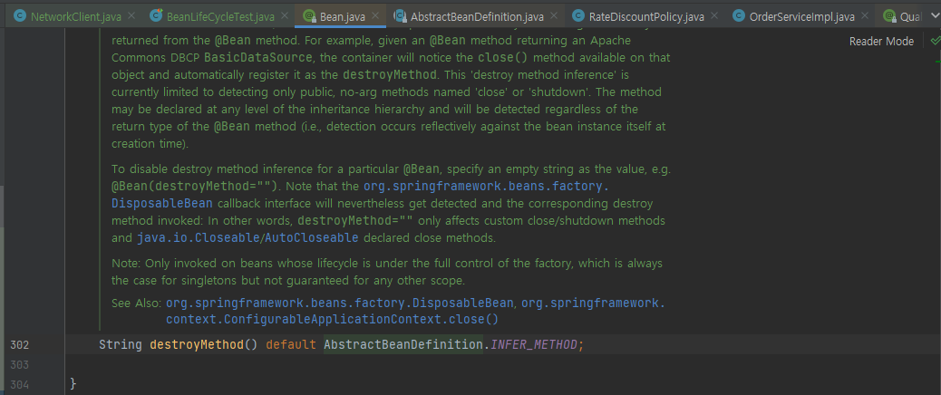 - @Bean의 'destroyMethod'는 기본값이 '(inferred)' (추론)으로 등록되어 있다.