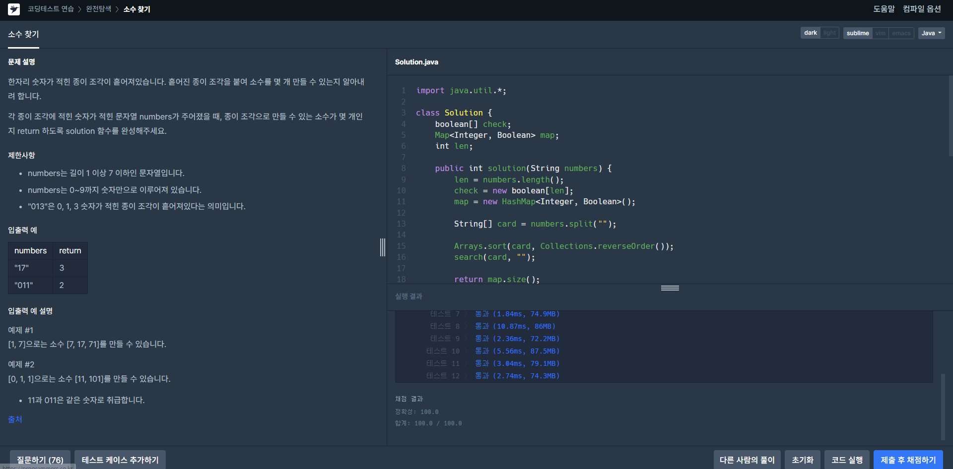 한자리 숫자가 적힌 종이 조각이 흩어져있습니다. 흩어진 종이 조각을 붙여 소수를 몇 개 만들 수 있는지 알아내려 합니다. 각 종이 조각에 적힌 숫자가 적힌 문자열 numbers가 주어졌을 때, 종이