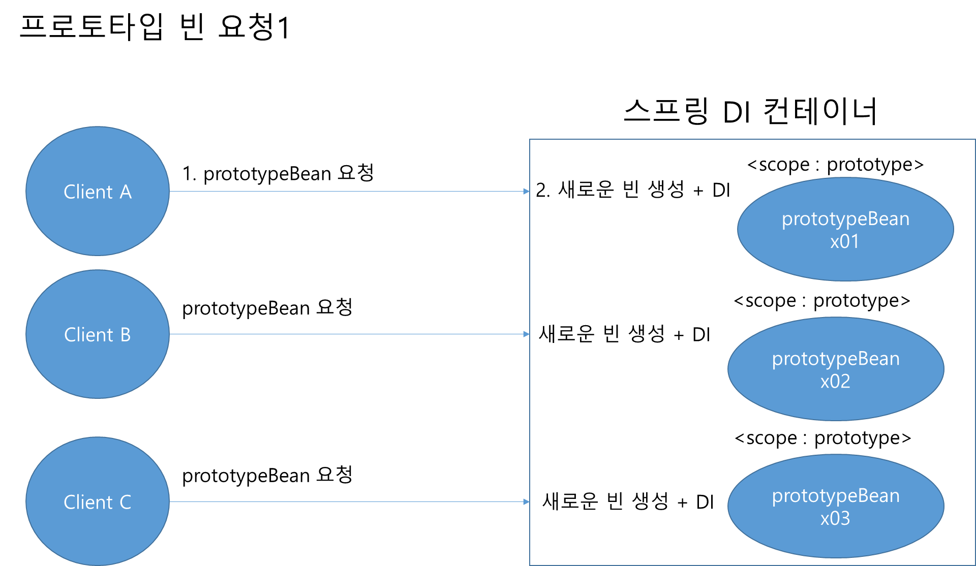 - 스프링 컨테이너에 요청할 때마다 새로 생성된다.
