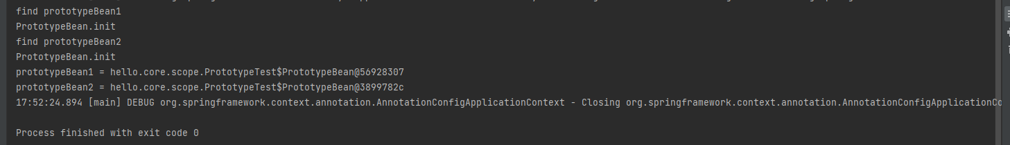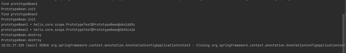 - 프로토타입 빈을 2번 조회했으므로 완전히 다른 스프링 빈이 생성되고, 초기화도 2번 실행된 것을 확인할 수 있다.