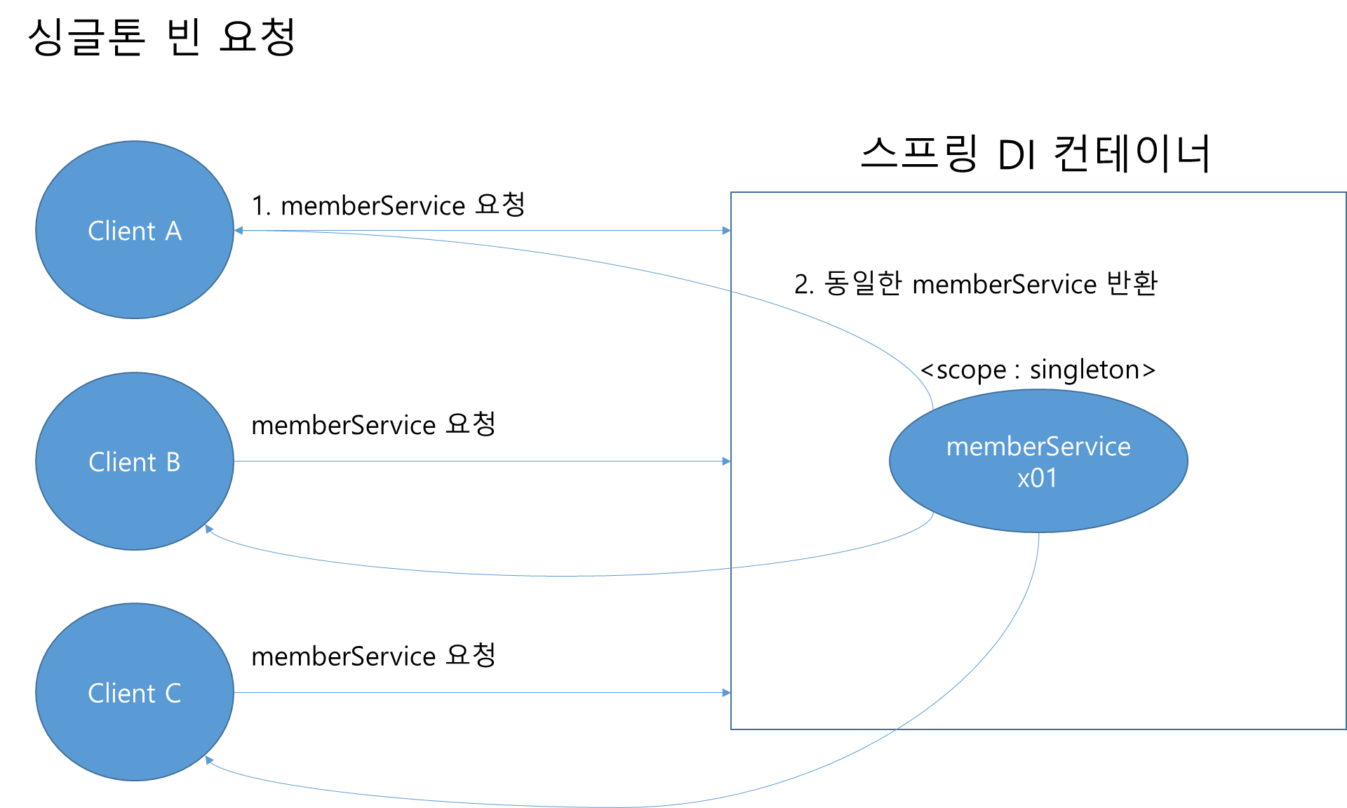 - 이후에 스프링 컨테이너에 같은 요청이 와도 같은 객체 인스턴스의 스프링 빈을 반환한다.