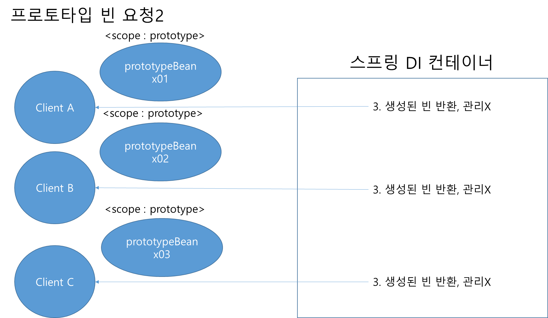- 3. 스프링 컨테이너는 생성한 프로토타입 빈을 클라이언트에 반환한다.