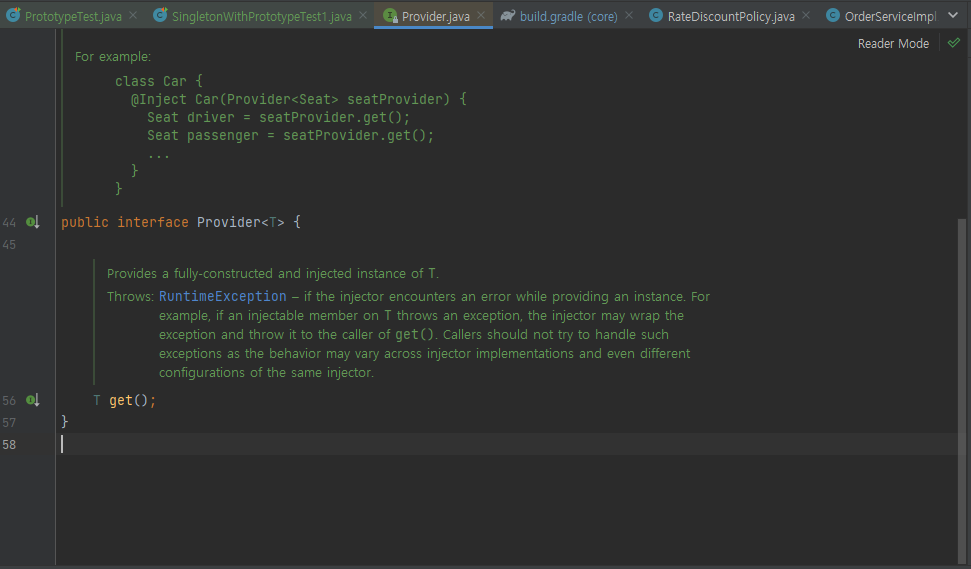 마지막 방법은 'javax.inject.Provider' 라는 JSR-330 자바 표준을 사용하는 방법이다.