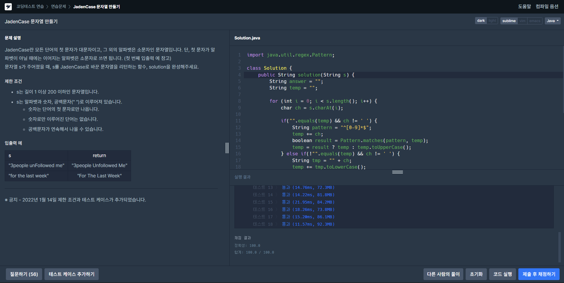 JadenCase란 모든 단어의 첫 문자가 대문자이고, 그 외의 알파벳은 소문자인 문자열입니다. 단, 첫 문자가 알파벳이 아닐 때에는 이어지는 알파벳은 소문자로 쓰면 됩니다. (첫 번째 입출력 예 참고)