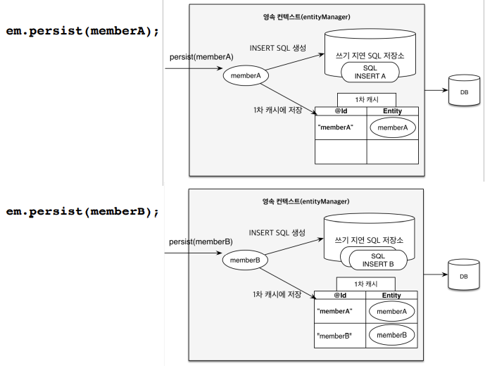 EntityManager.persist(entity) >> 엔티티 매니저를 통해서 엔티티를 영속성 컨텍스트에 저장하는 것 DB에 저장하는 것이 아니다.