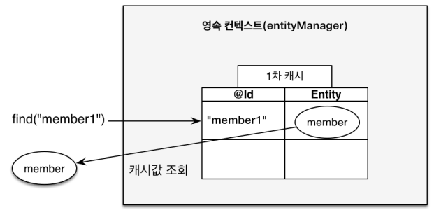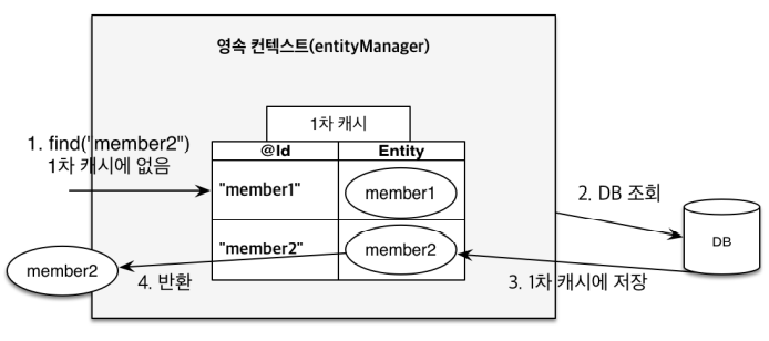 만약에 "member2"를 find 했을 때 1차 캐시에 없으면 DB에서 조회해온다.