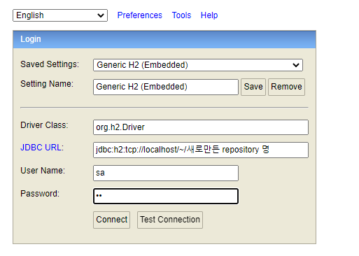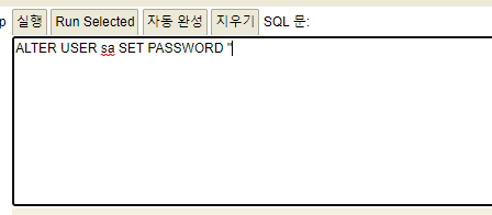 ALTER USER sa(사용자가 입력했던 사용자 명) SET PASSWORD ''(공란)