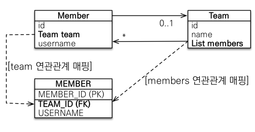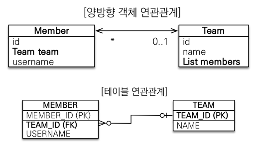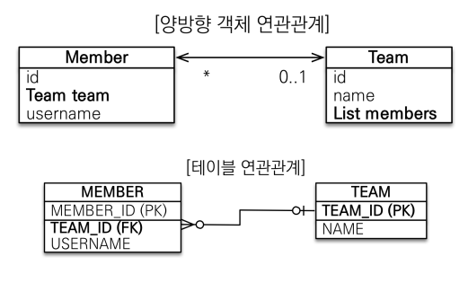 - 객체의 양방향 관계는 사실 양방향 관계가 아니라 서로 다른 단방향 관계 2개이다.