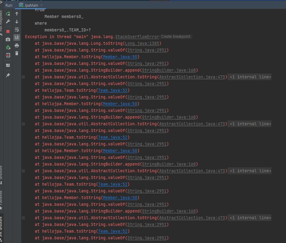 Member 클래스 안의 Team, Team 안의 Member를 계속 호출해서