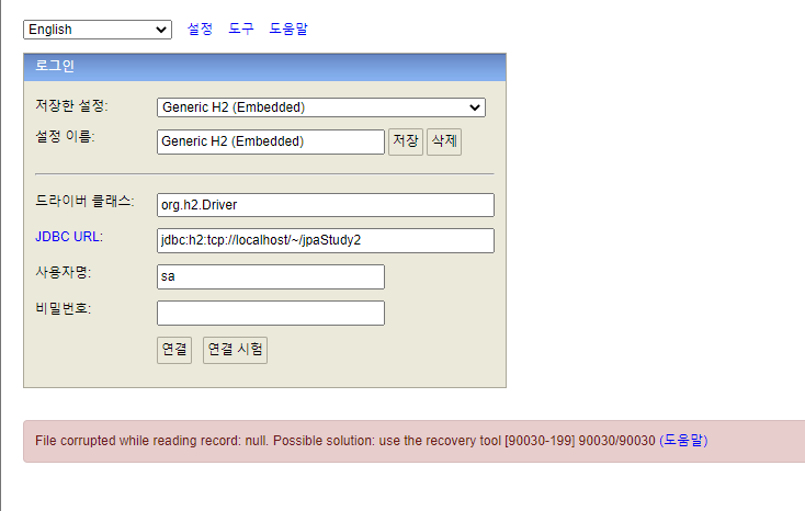h2 최신 버전에서 발생하는 쿼리 문제때문에 기존에 있었던 h2를 삭제하고, 다시 설치를 진행했는데.. 아래처럼 90030 에러가 뜨면서 연결이 안됩니다. <?xml version='1.0' encoding='UTF-8'?><persistence vers...