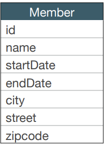 회원 엔티티는 이름, 근무 시작일, 근무 종료일, 주소, 도시, 주소번지, 주소 우편번호를 가진다.