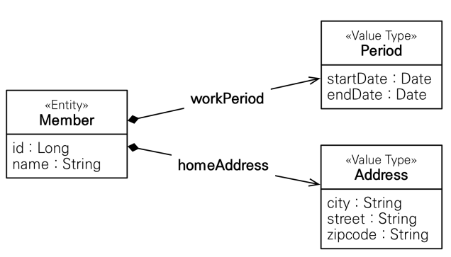 회원 엔티티는 이름, 근무 기간, 집 주소를 가진다.