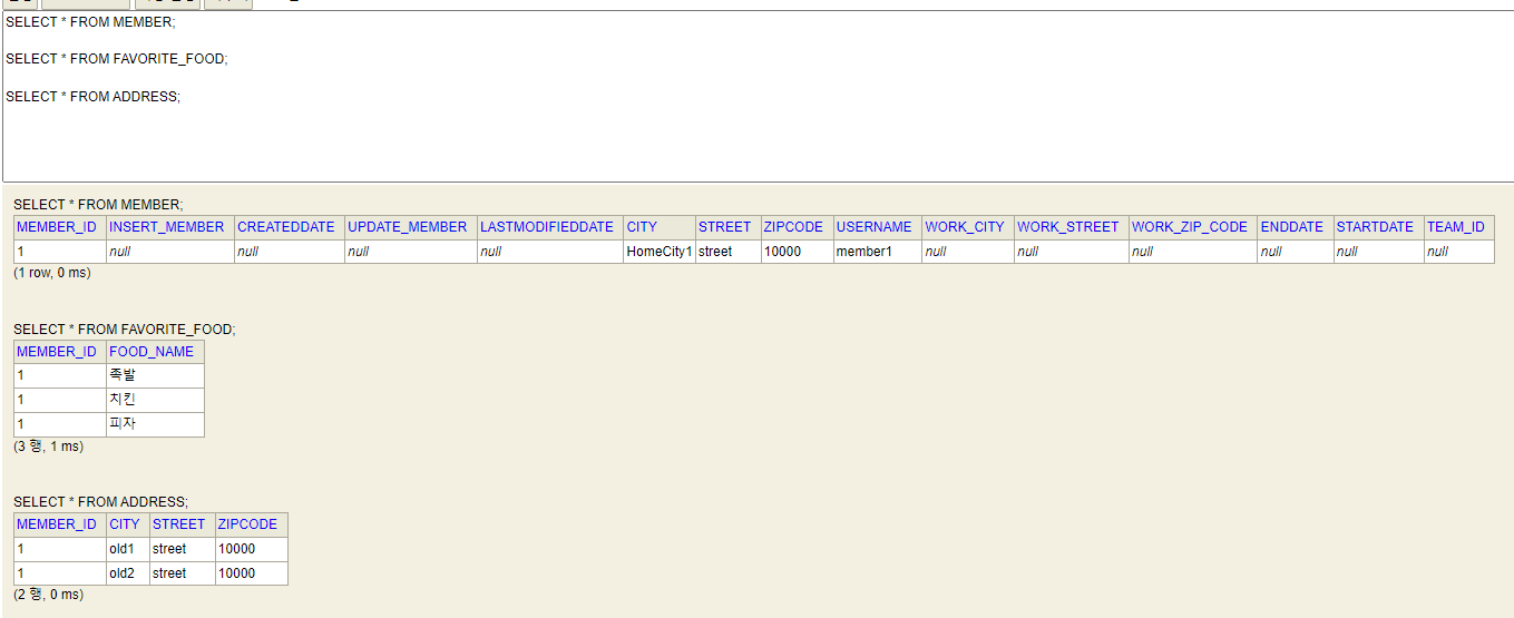 한 개의 Member, 두 개의 주소(old1, old2), 세 개의 선호 음식(치킨, 피자, 족발)이 들어갔다.