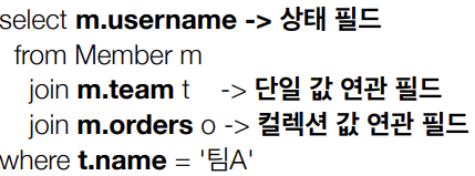 ① 상태 필드는 탐색을 하지 않는다. 그냥 상태 필드 자체로 하나의 값이기 때문이다. ex) m.username