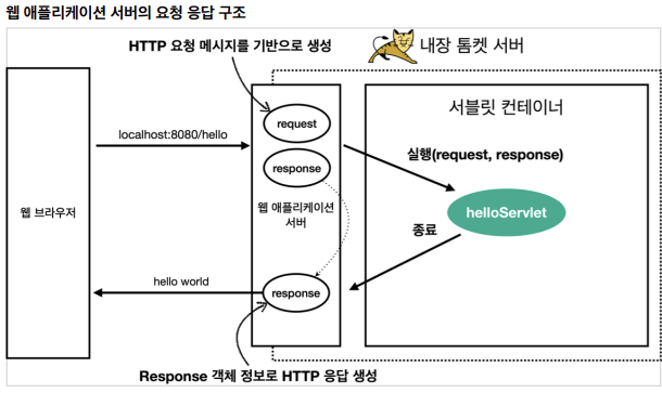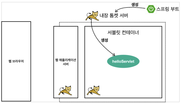 스프링 부트가 내장 톰캣 서버를 생성하고, 내장 톰캣은 서블릿 컨테이너 안에 있는 helloServlet을 생성하여 실행한다.