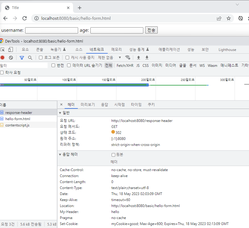 상태 코드는 302이고, Redirect 화면을 hello-form.html로 지정되어서