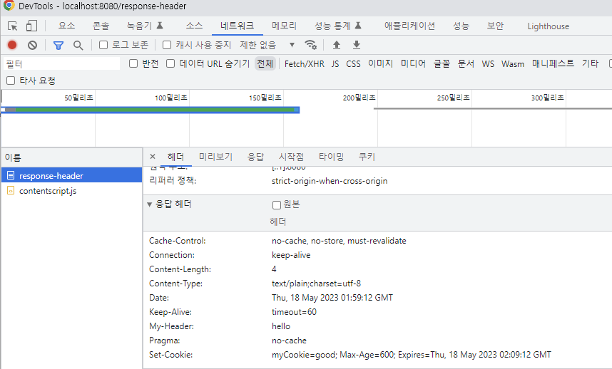헤더에 보면 내가 설정한 My-Header, Pragma, Content-Type 등이 들어간 것을 볼 수 있다.