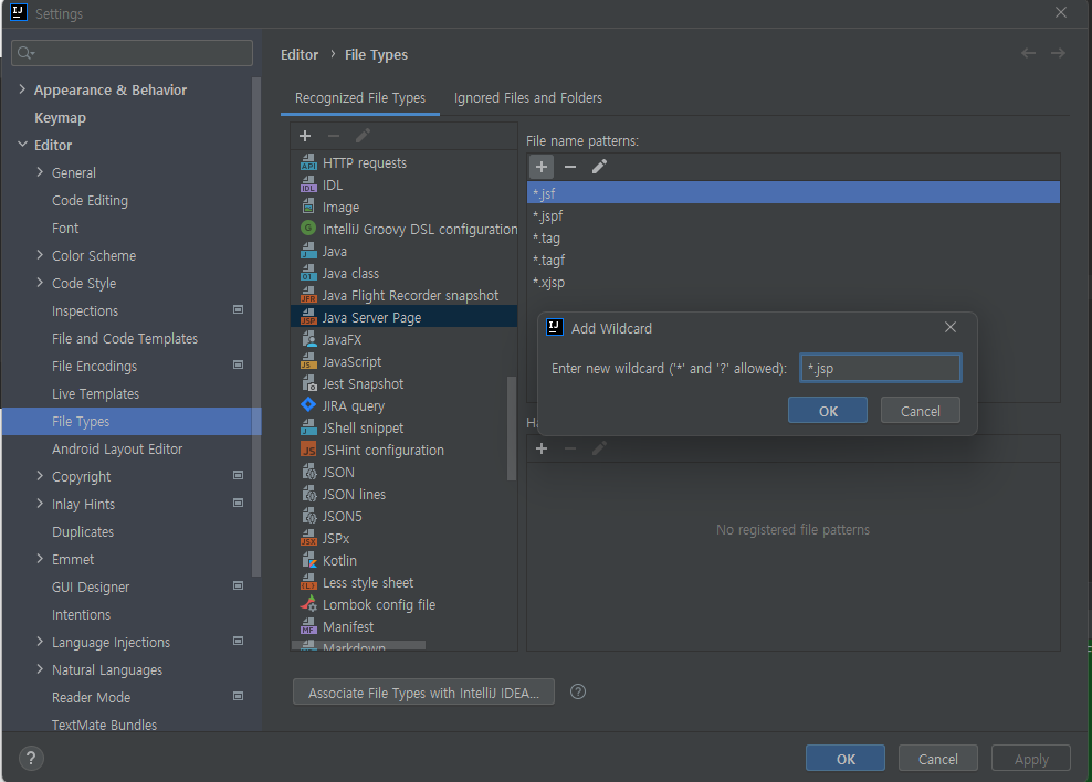 File > Settings > Editor > File Types > Java Server Page 를 찾아서