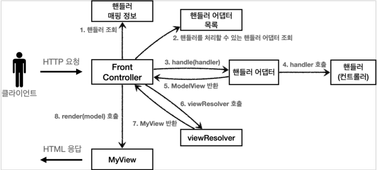 5. ModelAndView 반환: 핸들러 어댑터는 핸들러가 반환하는 정보를 ModelAndView로 변환해서 반환한다.