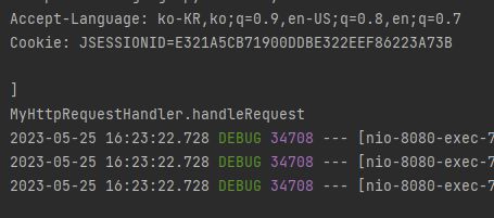 웹 브라우저에 빈 화면이 나오고, 콘솔에 MyHttpRequestHandler.handleRequest 가 출력되면 성공적으로 됐다.