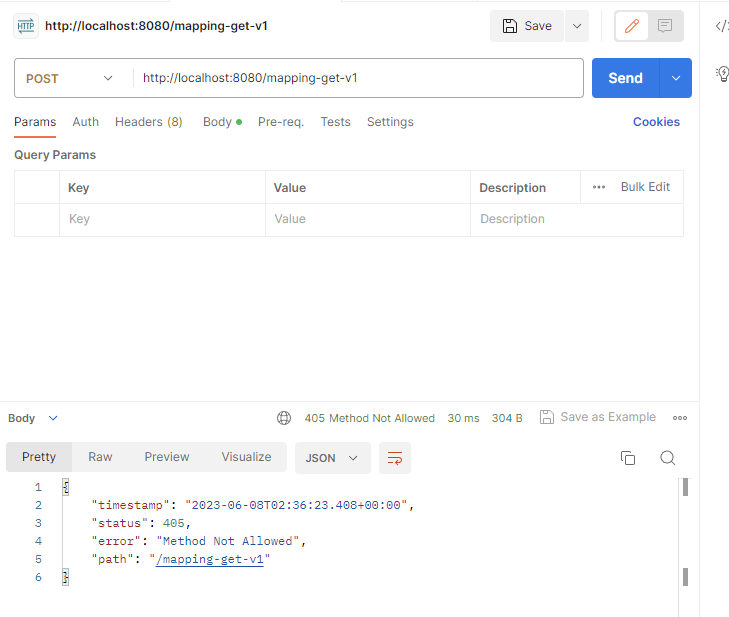 만약 여기에 POST 요청을 하면 스프링 MVC는 HTTP 405 상태 코드(Method Not Allowed)를 반환한다.