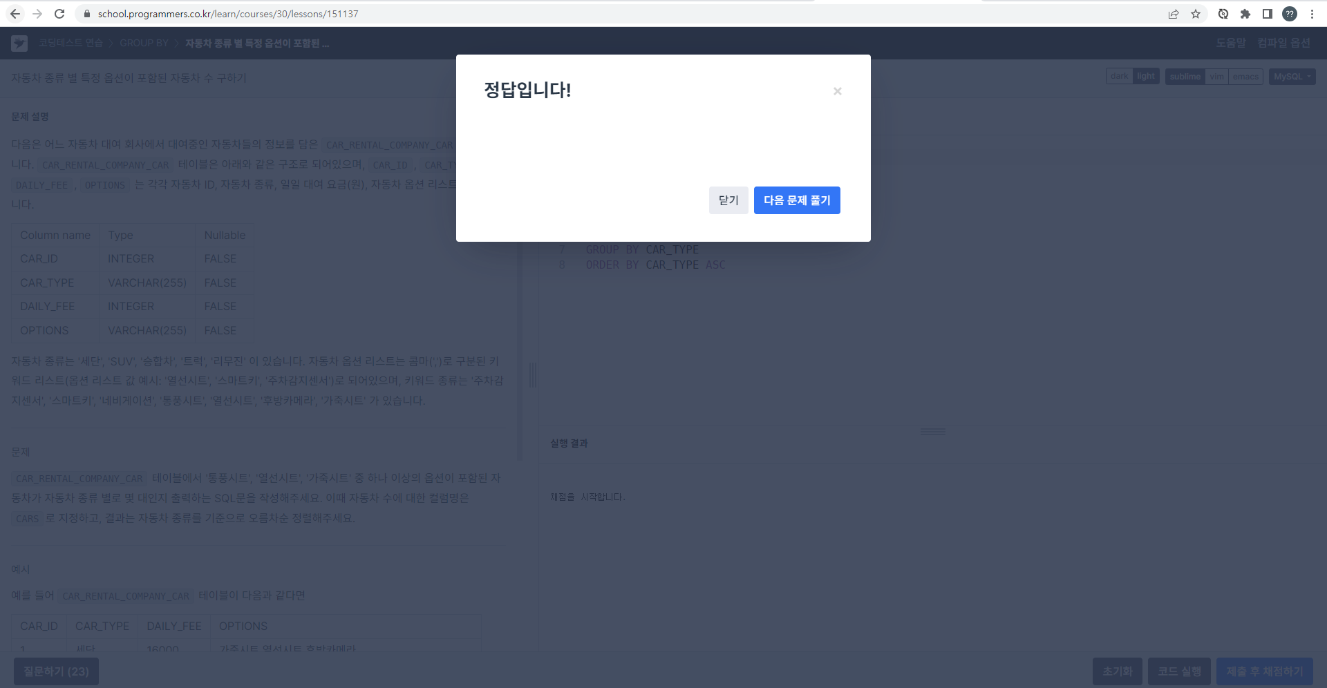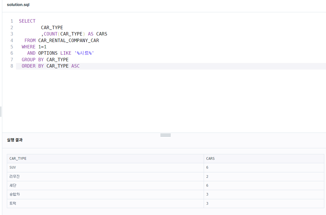② 이때 자동차 수에 대한 컬럼명은 CARS로 지정하고, 결과는 자동차 종류를 기준으로 오름차순 정렬해주세요.