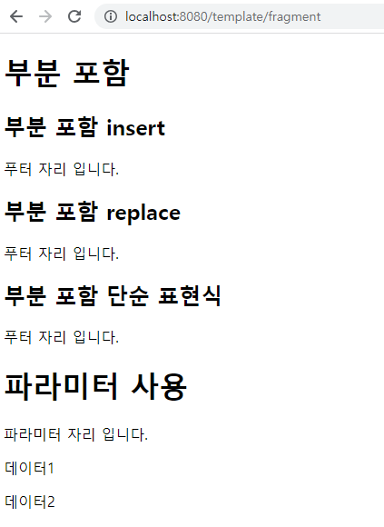 <div th:replace="~{template/fragment/footer :: copyParam ('데이터1', '데이터2')}"></div>