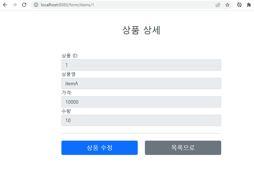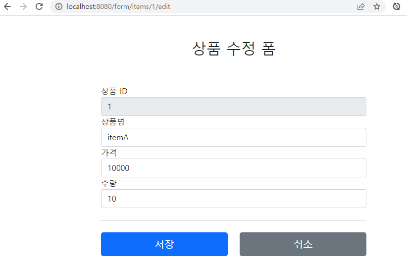 상품 수정 폼 컨트롤러 BasicItemController에 추가 @GetMapping("/{itemId}/edit") public String editForm(@PathVariable Long itemId, Model model) { Item item = itemRepository.findById(itemId); model.addAttribute("item", item); return "basic/editFor
