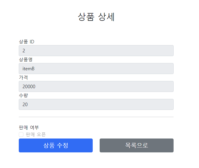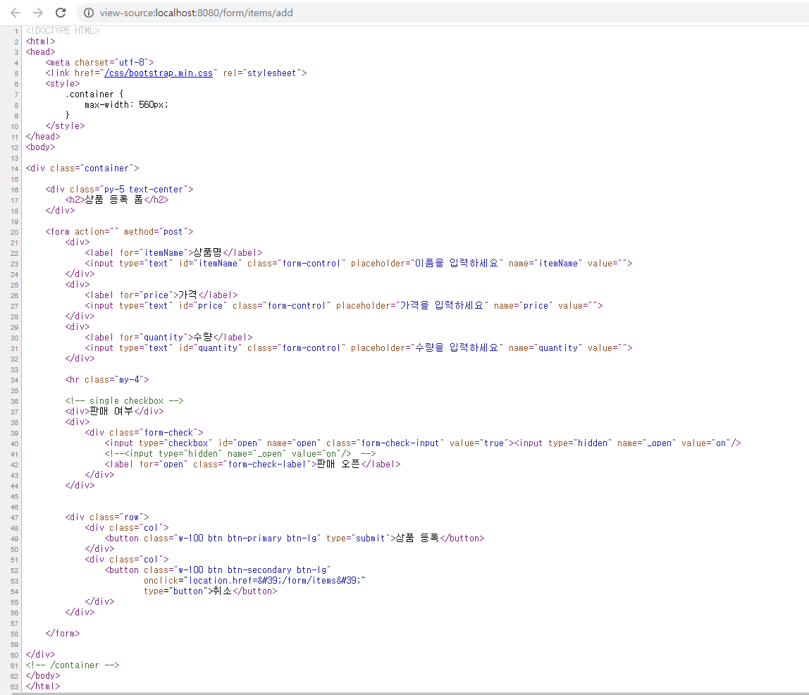 단순 HTML 체크 박스 resources/templates/form/addForm.html 추가 판매 여부 판매 오픈 상품이 등록되는 곳에 다음과 같이 로그를 남겨서 값이 잘 넘어오는지 확인해보자. FormItemController 추가 @PostMapping("/add")